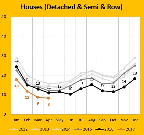 Two things stick out to me on this chart:. The most glaring one to me is sharp up-tick from 23% in March to 39% in April. The second thing I notice is how 2017 started out lower than 2016 in this measure then caught up in March and zoomed past it in April. I read this as confirmation that the "offer night" strategy was a lot less successful in April, which marks a turning point in the market. Again, I still think it's very much a seller's market (as can be seen in my April market charts), but this seems to at least indicate a cooling, and possibly a turning point in the market.