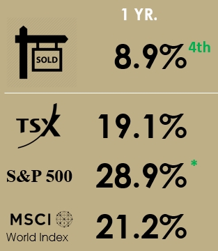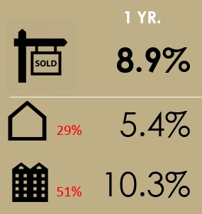 The housing numbers compare all transactions in Q4 (October to December) versus Q4 of the prior year. Keep in mind this "SOLD" sign represents all of Toronto residential real estate, so it's essentially a portfolio of all houses and condos sold in the 416 area code (from the western edge of Etobicoke to the eastern edge of Scarborough and everything south of Steeles). In that way it's much like the indexes on this chart, which are a portfolio of stocks (albeit a subset of top stocks). And like a stock index will have winners and losers, underlying that 8.9% 416 real estate portfolio number for Q4, condo apartments were up 10.3% YoY, while detached houses were 5.4%.