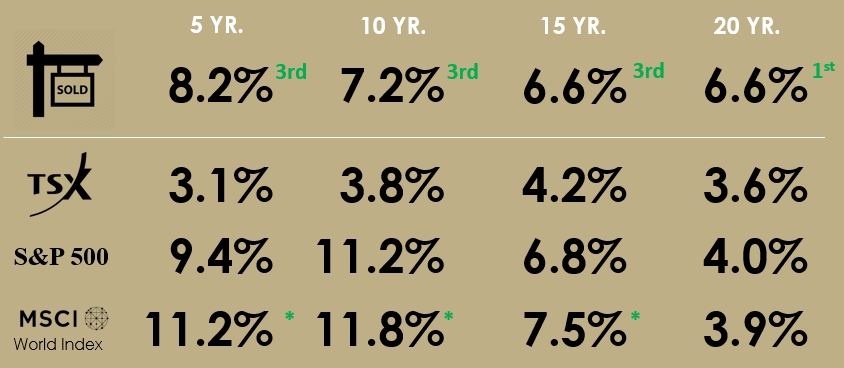 In the 23-year CAGR view (furthest out I have info for, from 1996 to 2019), the "Toronto real estate" return is 6.62%, which just noses out the S&P 500 which was 6.61%.