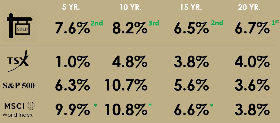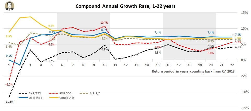 Toronto Real Estate (dotted brown line is composite number) is very competitive in any view you take here. For the outer 11 years (CAGRs from 1997 to now or 2007 to now), Toronto Real Estate has the best return, or is at most 0.1% behind the MSCI. And as you can tell from the chart, it's a lot less volatile than the stock indexes. From the 4 year CAGR to the 22 year CAGR the composite operates in a narrow 2% bar (6.2% to 8.3%).