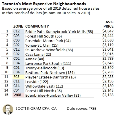 At the top of the list above you'll find Bridle Path-Sunnybrook-York Mills (BPSYM). Ho-hum. Each year I've looked at this since 2016 it has been #1, with Forest Hill South coming in at #2. The average for 2019 of $4,847K was up a whopping $514K from $4,469K, which was pulled upward by a lot of very high-end stuff, including four sales between $11 and $12 million last year. But even the median rose from $3,990K in 2018 to $4,300K last year.