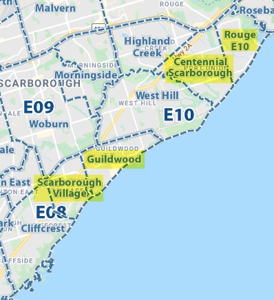 Four of the ones on the decliners list are in E08 and E10, which hugs lake Ontario from Midland Rd east to the Pickering border. The four are almost consecutive, with only West Hill in the middle escaping the top decliners list (though it fell one spot). Just out of the frame along Lake Ontario to the west is E06 Birchcliffe-Cliffside, which is number 3 on this list. I'm not sure why the lake isn't popular. You may remember above that Mimico (along the lake in the west) has been on the top gainers list the last couple of years.