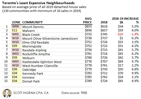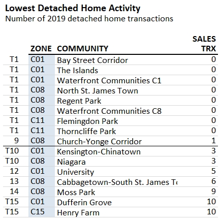 Data relates to the City of Toronto only (416). Only detached homes were used, to attempt the best possible “apples-to-apples” comparison. The “Top 15” lists exclude the 14 TREB neighbourhoods (of 144) with less than 10 detached house sales in 2019 (there were 17 excluded in 2018). Here's a list of the lowest 15 detached sales, of which the 14 under 10 were excluded from the analysis above. For the most part the housing in these areas are dominated by purpose-built rental apartments or condominiums.