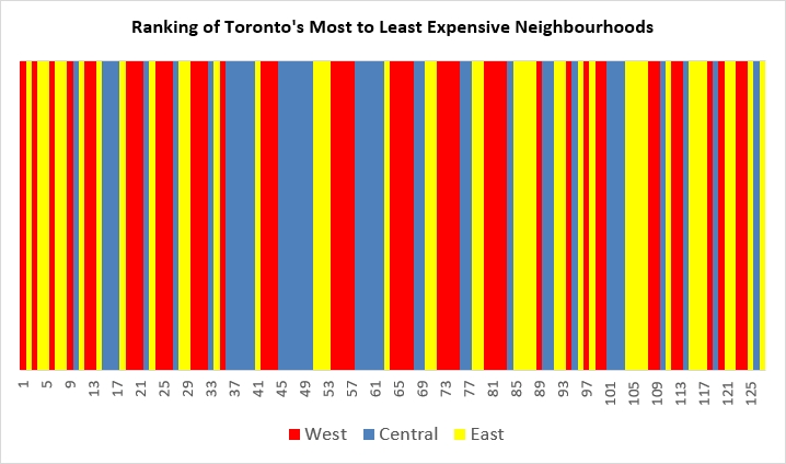 Going further down the list, 20 of the top 23 are in the central areas. Furthermore, only 2 central neighbourhoods are below the median: C3 Oakwood Vaughan (again, #74 this year) and C13 Victoria Village (was above last year, #69 this year). Not coincidentally those border the west and east regions respectively. This preference for the central zones is pretty evident on the chart below: