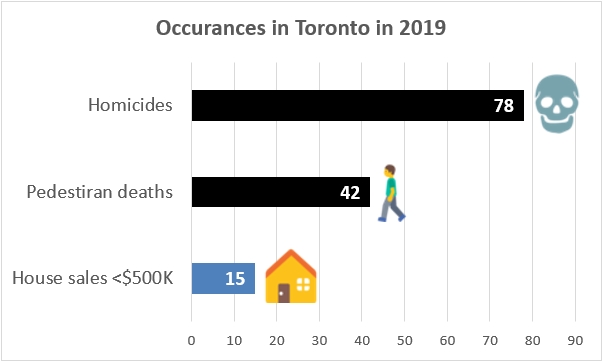 Above I mentioned how there are only 4 neighbourhoods with an average selling price of less than $750K. I decided to drop that bar a bit and I looked up how many houses (I excluded vacant lots) across the whole 630 square kilometres of the City of Toronto sold for under $500K during 2019. The answer was only 15. To look at that another way, there were over 5 times as many people murdered in Toronto last year as there were people that were able to buy a house under half a million dollars. Or nearly 3 times as many pedestrians were killed as people that bought houses for less than $500K.