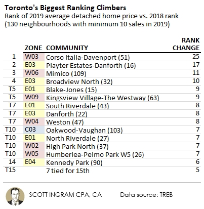 One to note here is C01 Dufferin Grove, down 16 spots. This is a great example of what I was talking about with lower sales numbers. In 2018 it was on the list of biggest ranking climbers, gaining 18 spaces. It had 20 detached sales with an average price of $1,763K. Of the 20 sales, 13 were for $1.5 million or more, and 7 were $2 million or more. Then in 2019 there were only 2 sales over $1.5 million. I sold one of those and based on the interest we had and the 8 offers, I can tell you that the area is strong and only getting stronger. But with relatively little sales, things can really swing from year to year.