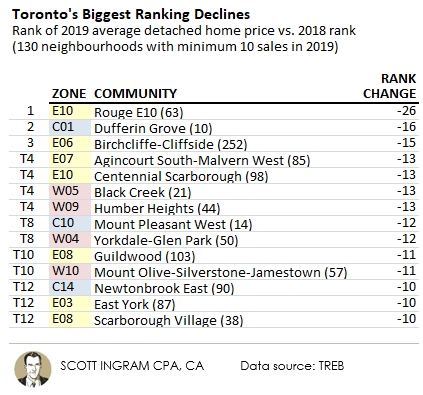 Here are the neighbourhoods that fell the most in rankings over the last year (2019 transactions in brackets).